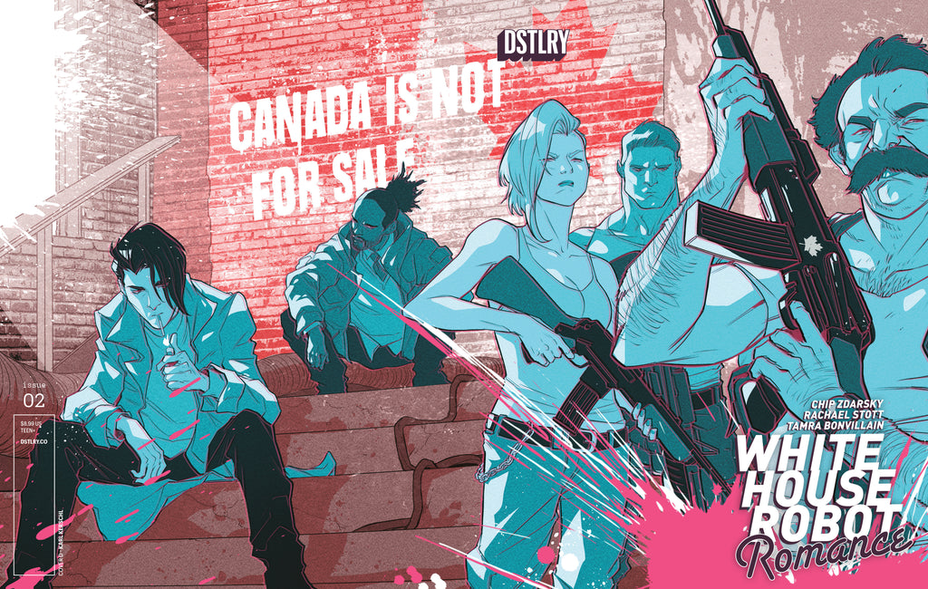Chef-9 and Service-1 are safely hidden from the White House Security team–for now. But Danny has discovered that there’s a new threat on the robot lovers’ heels: The Canadian Liberation Front, who will stop at nothing to protect their country. Every issue from DSTLRY is presented in our perfect bound Prestige format, featuring wraparound covers with spot gloss on robust cover stock, complemented by 48 pages of exquisite interior stock. It’s the DSTLRY difference. For fans of Blade Runner, The Island, and We Stand On Guard.