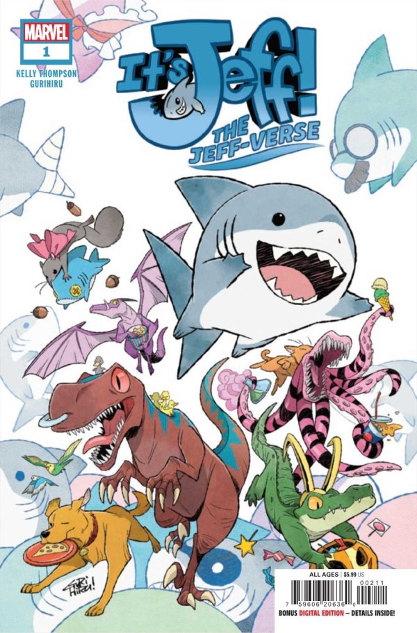 THE DANGEROUSLY ADORABLE JEFF THE LAND SHARK RETURNS! Jeff the Land Shark embarks on another series of madcap adventures with guest spots from some of your favorite heroes! Whether he’s orchestrating a pet shop takeover, or solving a high-stakes mystery like “what’s the best street-food snack” (the answer will SHOCK you, True Believer), Jeff is flipping his fantastic fins all over the Marvel Universe! Stealing hearts and cookies with equal impunity! Collecting issues #13-24 of the hit Infinity Comics series from the Marvel Unlimited app, this one-shot features a brand-new cover and never-before-seen story from beloved creators Kelly Thompson and Gurihiru!