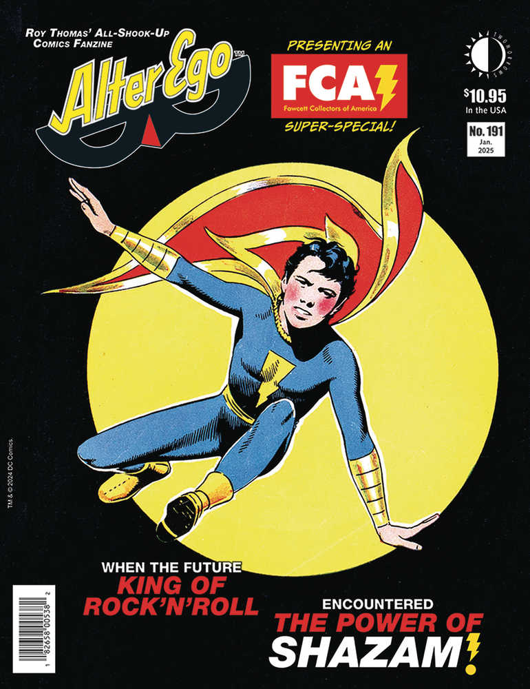 Alter Ego #191 is an FCA (Fawcett Collectors Of America) issue! Documenting the influence of Mac Raboy's Captain Marvel Jr. on the life, career, and look of Elvis Presley during his stellar career, from the 1950s through the cataclysmic concerns of the 1970s! Plus: Captain Marvel co-creator Bill Parker's complete testimony from the DC vs. Fawcett lawsuit, Michael T. Gilbert in Mr. Monster's Comic Crypt, and other sensational surprises!