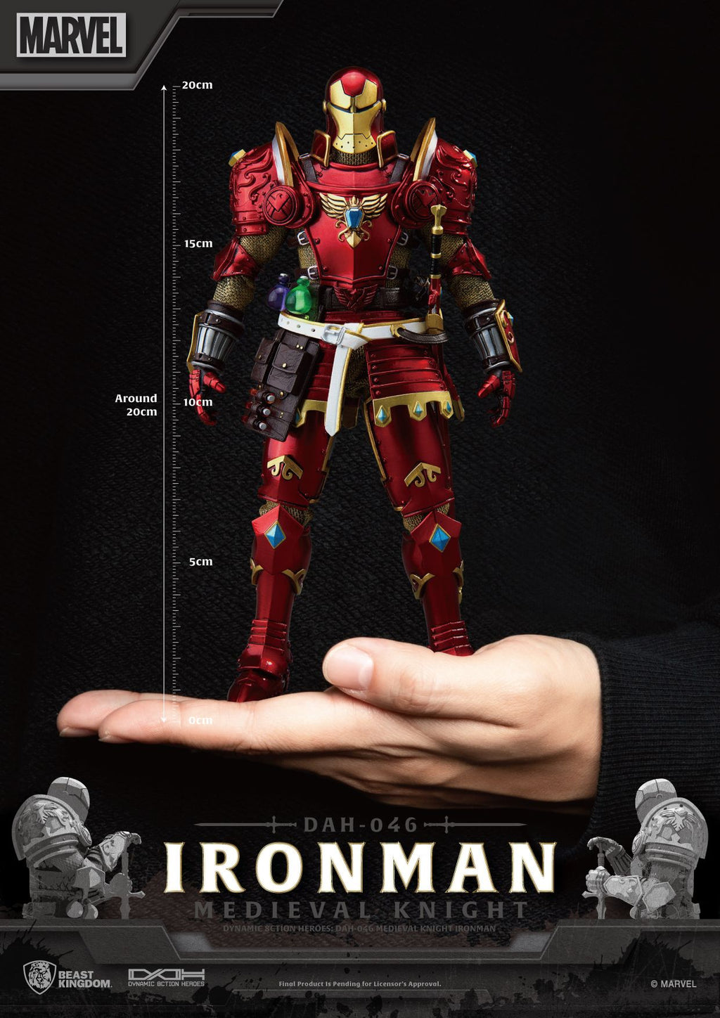 From Beast Kingdom. The latest in the DAH line-up is a new take on classic icons of Marvel Super Heroes with the release of the Iron Man DAH-046 and DAH-046DX medieval knight cross-over. Combining the technologically advanced Iron Man suit with a noble European medieval knight's armor, this unique mashup of old and new is an exclusive design from the minds of Beast Kingdom. The set recreates and combines a classic design with engravings and intricate details of yesteryear to create this aggressive looking Iron Man robotic style suit. The abundant list of accessories includes weapons, effects, and an engraved shield! Under Iron Man's armor, collectors can see real, golden designed chain mail used for the figures suit, just like the original knights wore! An LED light is also there in the same spot of the arc-reactor, this time with intricate detailing on the outside!